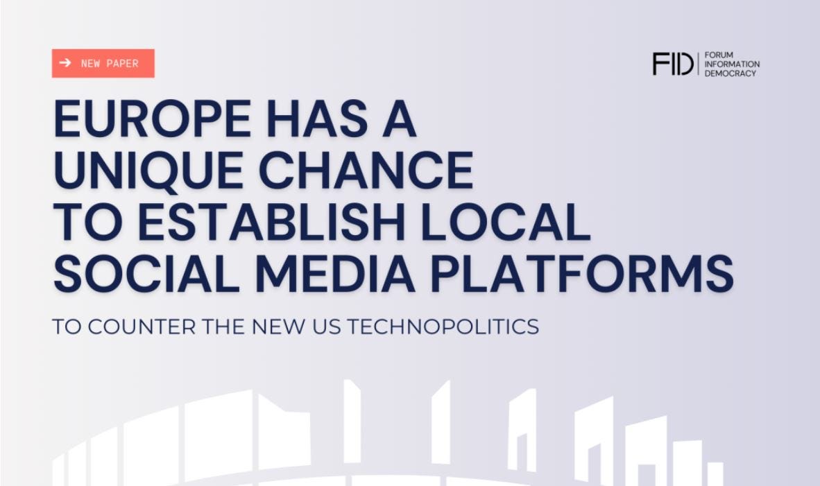 Image is from the April 2025 announcement by the Forum on Information and Democracy (FID) of a paper by a dozen scholars on a pathway for Europe to counter the US-based platforms of the tech oligarchs.